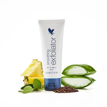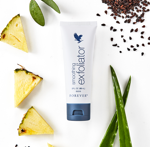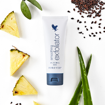 Bromelain, papain and lemon essential oil create a perfect natural skin tonic. Pineapple-derived bromelain has enzymatic abilities that assist in destroying the keratin of dead skin cells allowing them to be removed more easily. Papain, from papaya, assists in rejuvenating skin and is a rich source of vitamins C, A, E and pantothenic acid. Forever’s Smoothing Exfoliator is also infused with antioxidants like grape juice extract to provide the most effective and gentle exfoliating experience and lemon essential oil for instant hydration of the younger skin below the surface.
